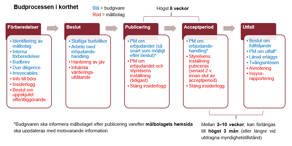 Vid offentliga uppköp ligger huvuddelen av arbetet på budgivaren. Som framgår av bilden ovan innefattar arbetet identifiering av målbolaget, interna överväganden, inklusive att säkerställa finansiering och nödvändiga tillstånd (t.ex. från konkurrensmyndigheter), skicka propå om bud (budbrev)[6] till målbolaget, genomföra en due diligence, ingå åtaganden med målbolagets huvudägare om att acceptera erbjudandet (irrevocables)[7], samt upprätta och offentliggöra pressmeddelanden och erbjudandehandling i enlighet med kraven i Takeover-reglerna.